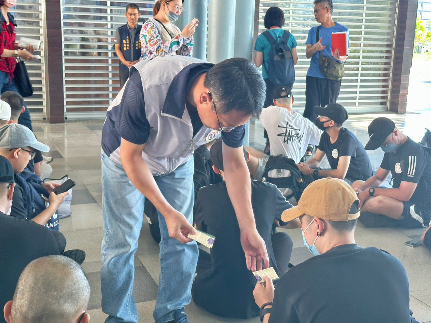 臺東縣軍人服務站站長曾仁政一早前往車站,向即將赴臺南官田及臺中成功嶺營區入伍的役男,發放每人一張軍友服務卡,同時介紹軍人服務站服務項目,宣導服役期間注意事項及權益,叮嚀入營之後應立即將部隊單位及幹部聯繫電話告知家屬報平安,以利家屬與部隊雙向聯繫,防止遭詐騙情事發生。