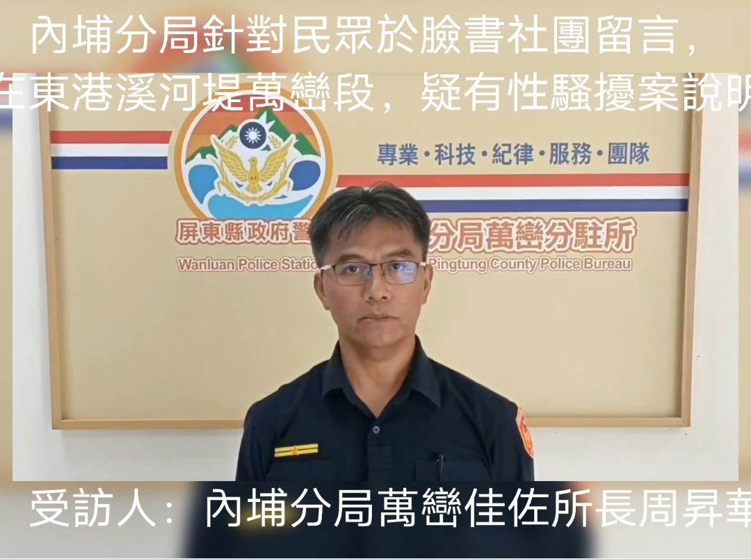 地方新聞 內埔分局針對民眾於臉書社團留言,在東港溪河堤萬巒段,疑有性騷擾案說明 by 豐勝傳媒 2025-09-04 作者 豐勝傳媒 2025-09-04 91 人觀看 91 【記者 詹士慶/屏東 內埔報導】 內埔分局針對民眾於臉書社團留言,在東港溪河堤萬巒段,疑有性騷擾案說明 ㄧ、東港溪河堤萬巒段,疑有性騷擾案 二、發生時間:114年9月4日。 三、案發經過:9月3日民眾於網路臉書留言,在東港溪河堤萬巒段,疑似有性騷擾案件,本分局已主動積極聯絡留言民眾報案中,並將加強該路段巡邏勤務,維護轄區治安。警方呼籲,鄉親若有發現可疑之人、事、物,請立即撥打110報案。 四、受訪人:內埔分局萬巒佳佐所長周昇華。 👮屏東縣政府警察局內埔分局👮 提供 你也許也喜歡 新版財劃爭議藍白縣市長串連 饒慶鈴北上為台東發聲 桃園之光 會稽國中心發明社 發明實力揚名國際 雅加達展現創新實力 桃園市府公益揭弊者保護法宣導 高檢署檢察官陳淑雲全面解析 四大計畫整合 打造南島文化客廳 七國藝術家齊聚交流 從臺東走向世界 上一篇 交通安全宣導深入社區零距離 東港警村里 廣播共維用路人安全 下一篇 高雄市大寮區188市道機車與大貨車擦撞女騎士受傷送醫 警馳赴處理 疏導交通 相關文章 深化人權教育 高師大辦理... 2025-12-14 高師大攜手義大、屏大舉辦... 2025-12-13 高師大攜手新一代兒童週報... 2025-12-08 高師大承辦2025自主學... 2025-12-03 惡地社會學:高師大USR... 2025-11-18 2025臺灣教育科技展 ... 2025-11-15