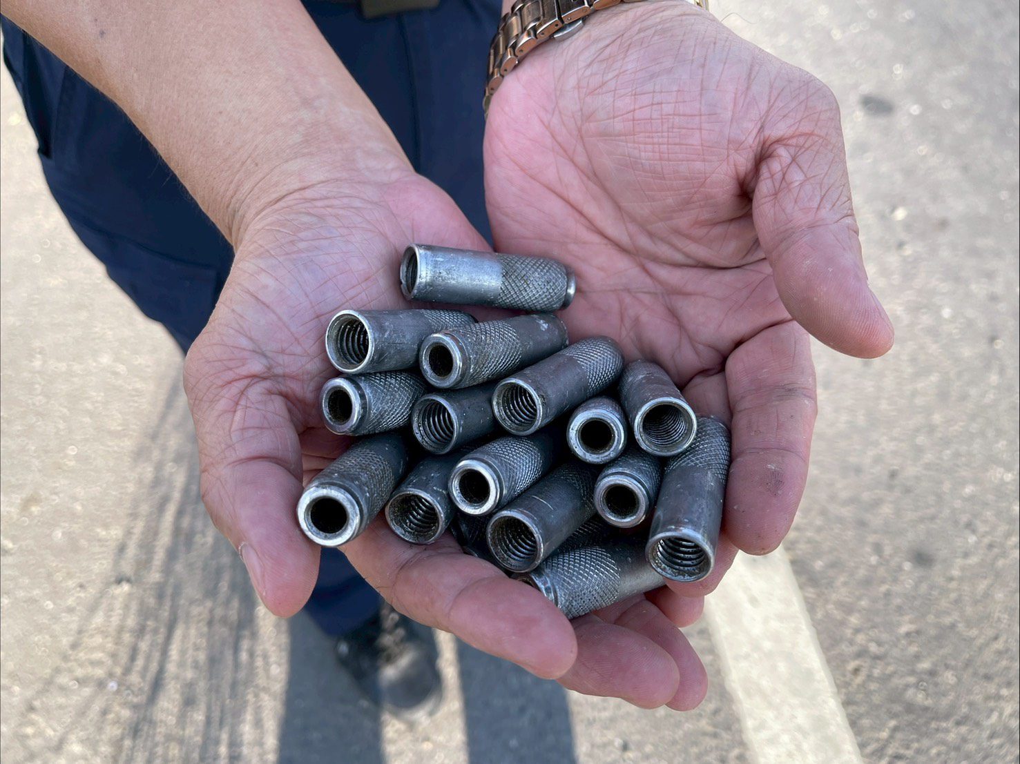 湖內分局一甲派出所巡佐陳漢威、警員李健豪日前擔服巡邏勤務時,獲報平交道旁有大支螺絲散落在路上,由於該路段車流量大,不時有大型車輛經過車速又快,員警擔心造成行車打滑發生危險,立即於現場進行警戒,並待清潔隊尚未到場前,協助掃地清理路面,約30分鐘後順利排除,還給用路人安全的行車空間。