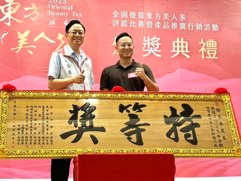 桃園市長張善政表示,全國優質東方美人茶特等獎,2023、2024年由桃園尚好茗茶獲獎,2025年則由龍潭文新製茶廠謝來英獲獎,桃園一舉蟬聯3連霸佳績,感謝在地茶農用心付出,打響桃園優質農產名號;市府也會持續當農友後盾,積極推廣智慧茶園管理,並進行即時監測及災害預防,成立桃園智慧農耕團,解決茶產業從業人員短缺及高齡化等挑戰,期盼在政府相關部門、農民攜手合作下,合力讓台灣茶產業持續飄香、永續發展。