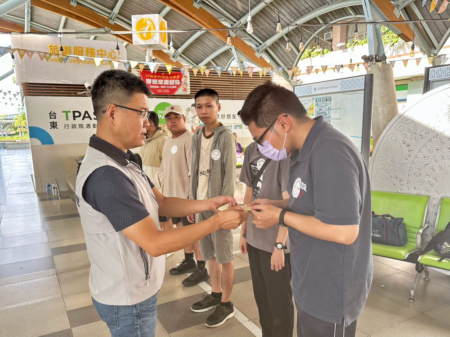 臺東縣軍人服務站長曾仁政今(8)日一早前往臺東火車站,歡送即將赴高雄黃埔營區報到的補充兵第431梯次役男,除發放每人一張軍友服務卡,介紹軍人服務站服務項目,宣導服役期間注意事項及權益,叮嚀役男入營後應立即將部隊單位及幹部聯繫電話告知家屬報平安,以利家屬與部隊雙向聯繫,防止遭詐騙情事發生。