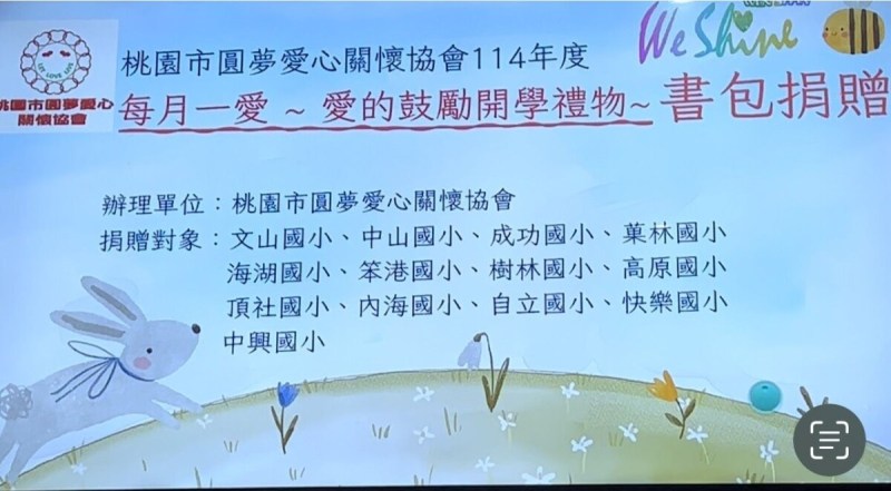 這個月是圓夢愛心協會第140場愛心活動,協會團隊實際走訪學校,校長提出孩子最重要的需求是書包,於是,協會認真慎選了一個多功能且符合人體工學的書包,並攜手善心人士共同採購了650個書包, 市價將近100萬元,送給桃園成功國小 、中山國小、笨港國小 、海湖國小 、樹林國小 、高原國小 、頂社國小 、內海國小 、自立國小 、菓林國小 、快樂國小 、中興國小 、文山國小等,這13所學校弱勢的孩子,讓孩子們背起書包,快樂的上學去。