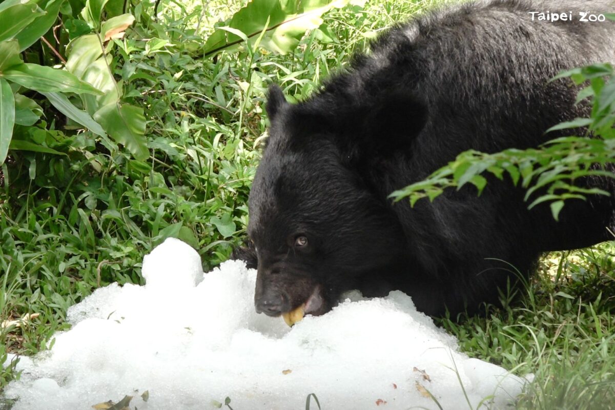 位在臺灣動物區的亞洲黑熊「黑輪」也沒錯過這場夏日盛宴!保育員和實習生們把香蕉、蘋果、西瓜、鳳梨等水果埋在碎冰之中,疊成小山的碎冰更是像極了冰品店裡端來的一碗剉冰模樣。黑熊「黑輪」步入活動場後,利用靈敏的嗅覺捕捉到水果的香氣,再以粗壯的前臂來探索那座小冰山。黑熊「黑輪」挖出水果後,便盤腿坐在地上享受自己「舀冰」所得到的美食,悠哉地啃著戰利品,一副「這就是夏天的味道」的滿足模樣。