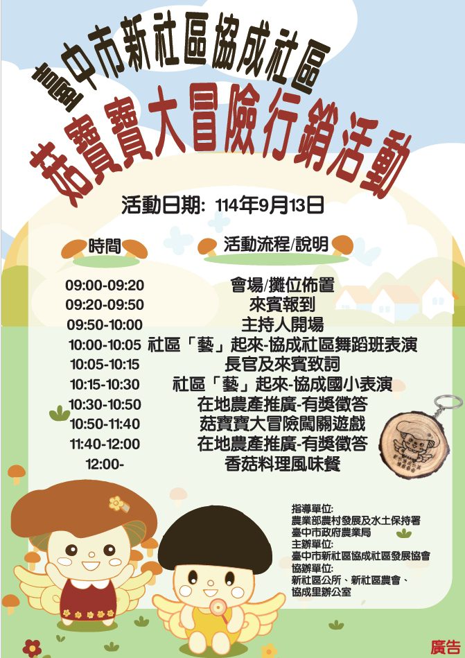 文以載道 台中協成社區推廣香菇暨農特產 明辦食農教育體驗活動 by 豐勝傳媒 2025-09-13 作者 豐勝傳媒 2025-09-13 79 人觀看 79 台中市政府農業局輔導新社區協成社區發展協會,將於明(13)日上午9時50分在協成社區發展協會活動中心旁籃球場( […] 你也許也喜歡 楊子儀領跑蔬跑盃 《你跑步,我送餐》萬份蔬食便當暖心送出 投書/公寓大廈管理條例應調整禁寵令 比照住宅法同意局部開放 因應中秋節來臨加班趕製月餅 中市勞工局提醒雇主仍應注意勞動權益 高齡志工綻放銀響力 台中市宣導活動展現志工新風貌 上一篇 防失智從生活做起 嘉市府辦講座教民眾「存腦本」 下一篇 台中市工業會理監事聯席會議 經發局長:因應美國關稅 分散市場化危機為轉機 相關文章 〈穆公亡馬〉:千載傳頌的... 2025-10-06 高師大策辦「拉阿魯哇族暨... 2025-09-27 中歐班列南線崛起 波蘭線... 2025-09-22 網友要她領60萬元投資 ... 2025-09-16 老嫗迷航25公里 AIR... 2025-09-16 男拒檢逃逸 三民第一分局... 2025-09-16