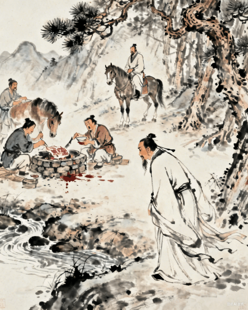 那是一個秋高氣爽的日子,秦穆公率領侍從外出打獵,不料心愛的千里駒竟在途中走失。這匹駿馬毛色如墨,日行千里,是穆公的心頭至愛。心急如焚的穆公親自帶人四處搜尋,最終在一片林中空地發現了令人震驚的景象 —— 一群山野村夫正圍坐在篝火旁,享用著馬肉大餐,而地上散落的馬皮和馬骨,正是他失蹤的寶馬。