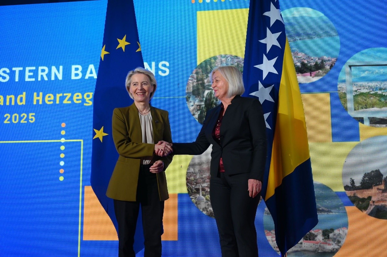 當天晚些時候,馮德萊恩在塞拉耶佛會見波士尼亞和赫塞哥維納(簡稱波赫)高層(包括波赫理事會或政府代表),肯定波赫在「改革議程」上的進展,並表示歐盟為波赫量身打造的成長計畫(Western Balkans Growth Plan)可望吸引近10億歐元投資,用以改善交通、能源、數位基礎建設與日常生活成本(例如降低跨境手續費與漫遊費)。然而,要把這些計畫轉化為實際資金與項目,波赫必須完成幾項前置條件——最關鍵的是任命首席談判代表,以便啟動首場政府間會議(first intergovernmental conference),並在司法與其他關鍵改革上展現決心與團結。